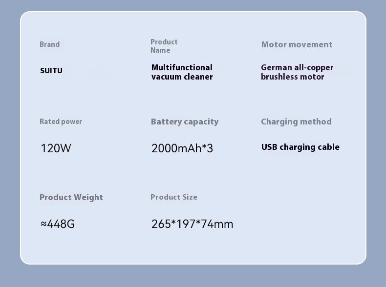 Vacuum cleaner * 1+brush * 1, 2-in-1 flat suction set 1pcs, instruction manual 1pcs, USB charging cable 1pcs, floor brush connecting tube * 1, floor brush * 1, adapter white * 2